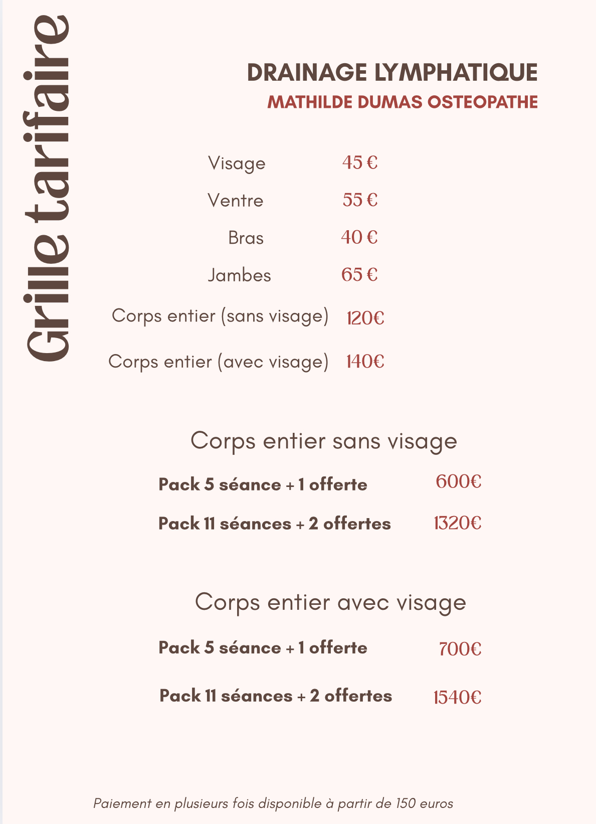 Au cabinet, je privilégie une approche individualisée et respectueuse du corps. Le drainage lymphatique peut être proposé seul ou en complément d’un suivi ostéopathique, toujours dans le cadre d’un accompagnement global et adapté.